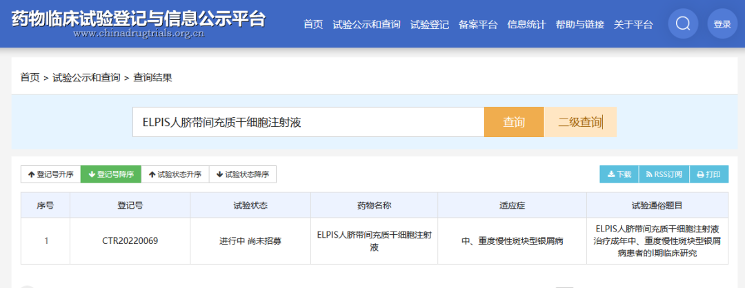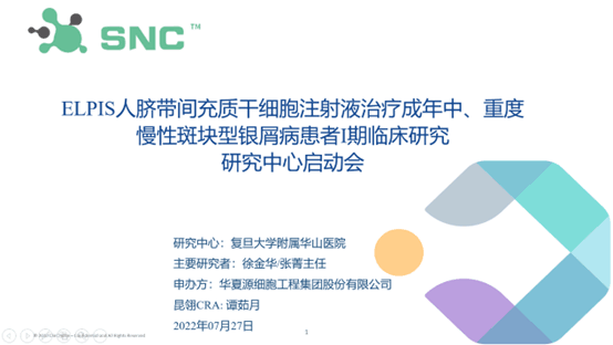 本项研究题目为“ELPIS人脐带间充质干细胞注射液治疗成年中、重度慢性斑块型银屑病患者的I期临床研究”,由复旦大学附属华山医院作为组长单位率先启动,另有上海市皮肤病医院、北京大学第三医院、中南大学湘雅医院作为分中心参与。