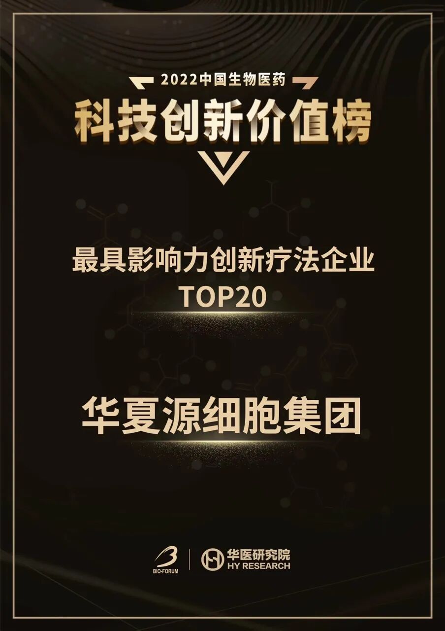 2022年11月10日,由上海市生物医药科技发展中心、上海市静安区科学技术委员会、上海大宁资产经营(集团)有限公司指导,上海市生物医药行业协会携手医耘科技发起,华医研究院提供数据支持的“2022中国生物医药科技创新价值榜”重磅揭晓,华夏源荣登“最具影响力创新疗法企业TOP20”榜单。