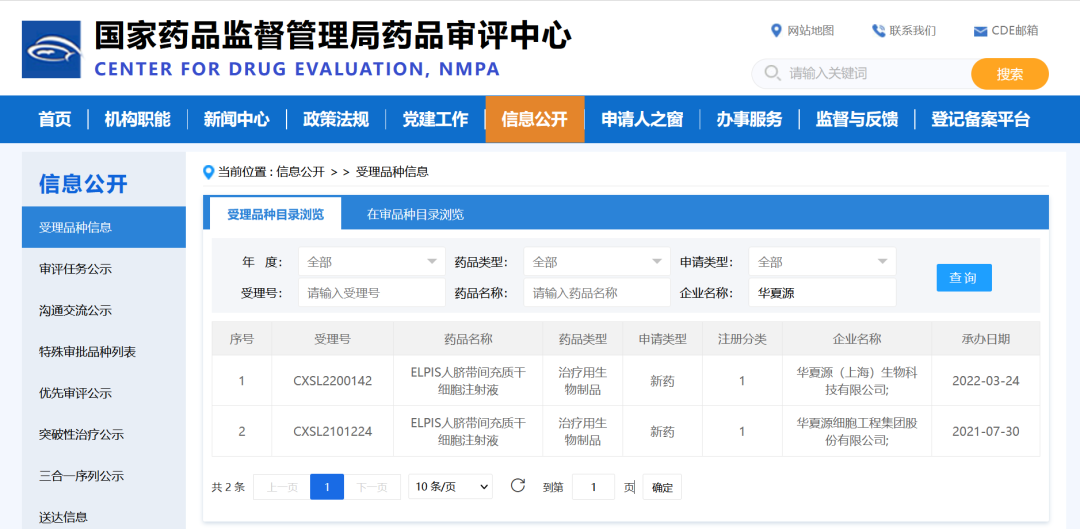 △ 国家药监局官网:华夏源“ELPIS人脐带间充质干细胞注射”IND申请受理公示