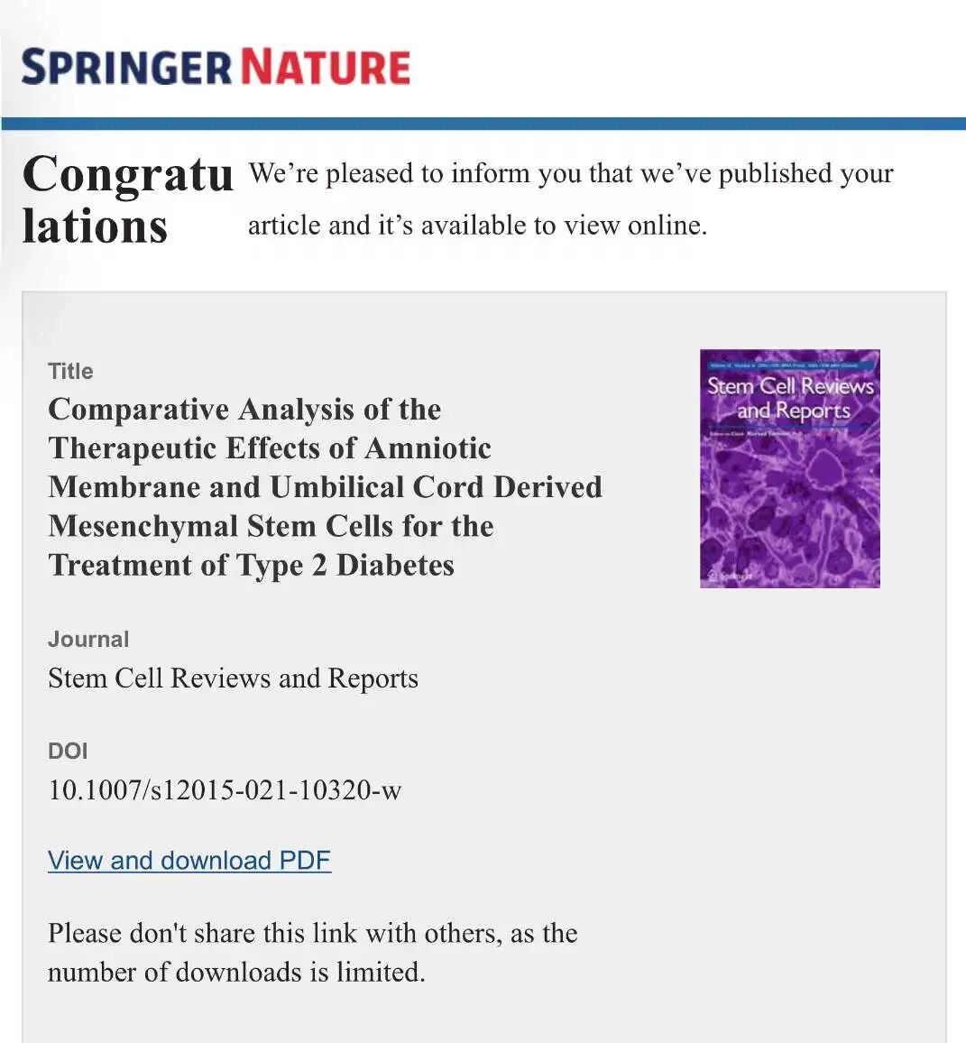 近日,国际干细胞领域权威期刊《Stem Cell Reviews and Reports》接收并发表了由华夏源细胞集团CEO朱灏博士、CTO王志峰博士、高级科学家李海森博士等撰写的题为《羊膜与脐带间充质干细胞治疗Ⅱ型糖尿病疗效对比分析》的学术论文。