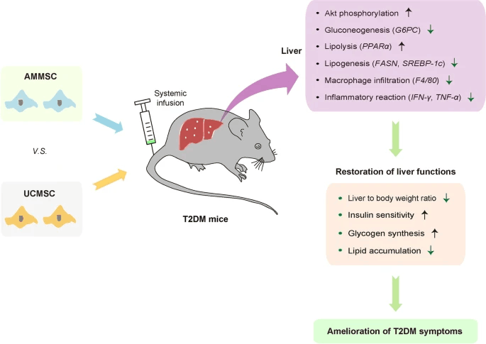 机制研究表明,人脐带或羊膜间充质干细胞注射可以极大改善db/db鼠的肝脏糖脂代谢紊乱,具体体现在显著降低的肝脏体重比、逆转脂肪肝、肝糖原合成能力加强、肝脏炎症反应被有效抑制及胰岛素信号通路加强等。