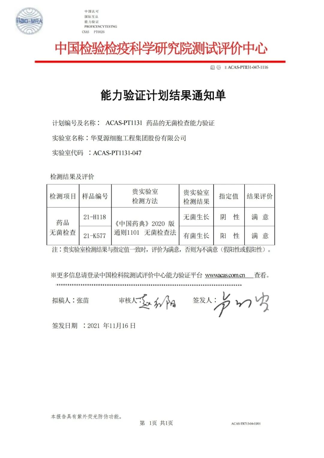 能力验证是政府监管部门评定和监督实验室技术能力的重要措施,通过此次能力认证,华夏源药品无菌检测能力的稳定性、可靠性得到了全面验证,充分显示了华夏源质量部门检测能力的可信性和整体检测水平,进一步为华夏源的细胞药物生产和研发提供了技术安全保障。