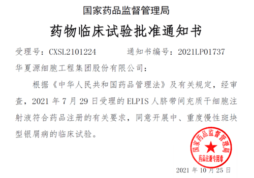 2021年10月25日,华夏源细胞工程集团股份有限公司自主研发的Ⅰ类生物制品,“ELPIS人脐带间充质干细胞注射液”(受理号CXSL2101224),正式获得国家药监局药品审评中心(CDE)的药物临床试验批准通知(通知书编号:2021LP01737)。