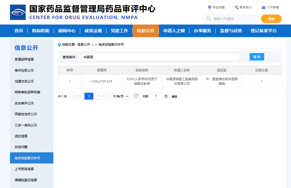 △ 国家药监局官网:华夏源“ELPIS人脐带间充质干细胞注射”获临床试验默示许可