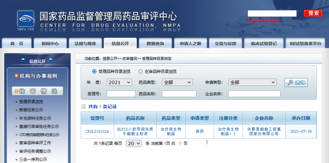 △ 国家药监局官网:华夏源“ELPIS人脐带间充质干细胞注射”IND申请受理公示